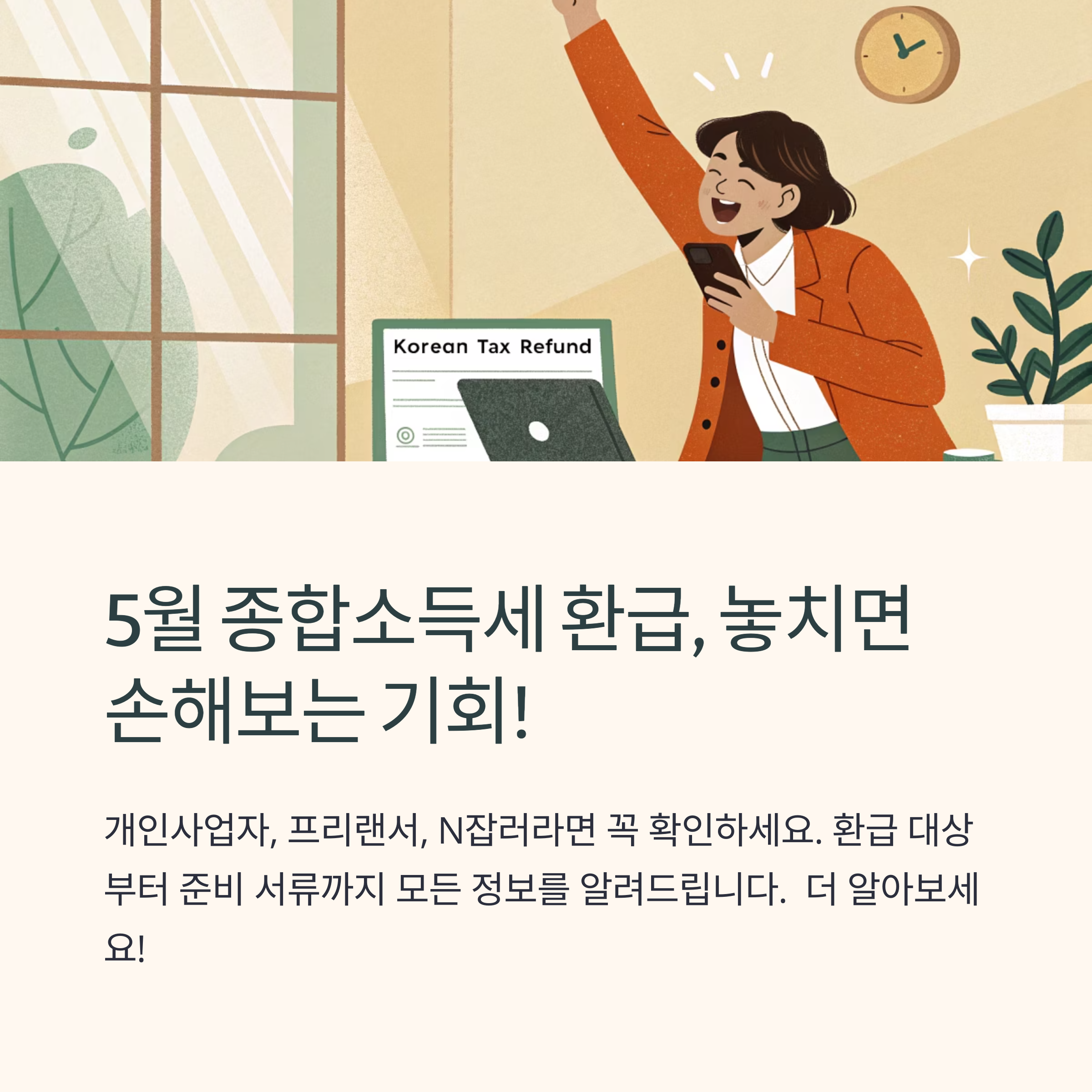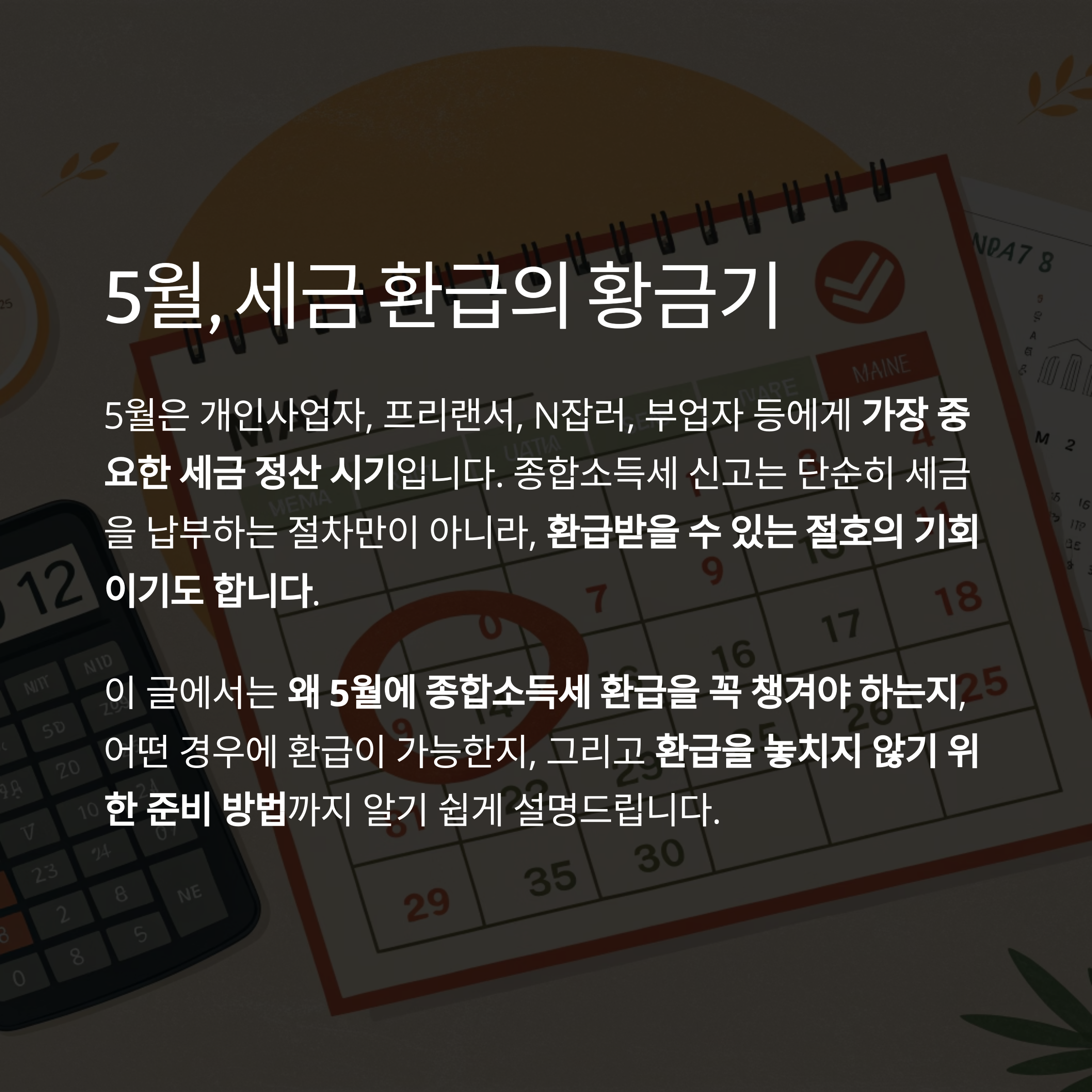 5월은 개인사업자, 프리랜서, N잡러, 부업자 등에게 가장 중요한 세금 정산 시기입니다. 종합소득세 신고는 단순히 세금을 납부하는 절차만이 아니라, 환급받을 수 있는 절호의 기회이기도 합니다. 이 글에서는 왜 5월에 종합소득세 환급을 꼭 챙겨야 하는지, 어떤 경우에 환급이 가능한지, 그리고 환급을 놓치지 않기 위한 준비 방법까지 알기 쉽게 설명드립니다.