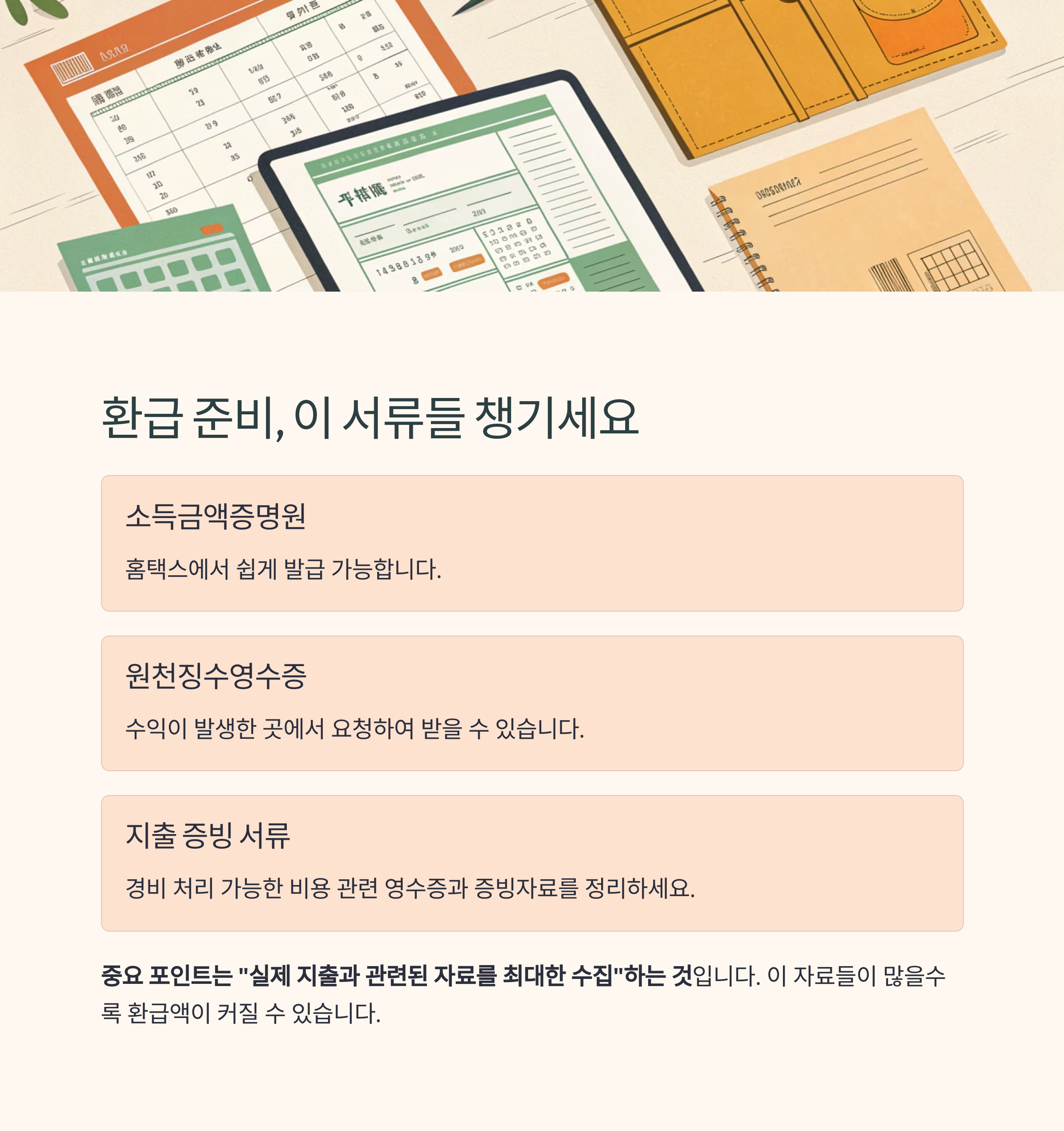 종합소득세 환급을 위해 기본적으로 준비해야 할 서류는 다음과 같습니다.