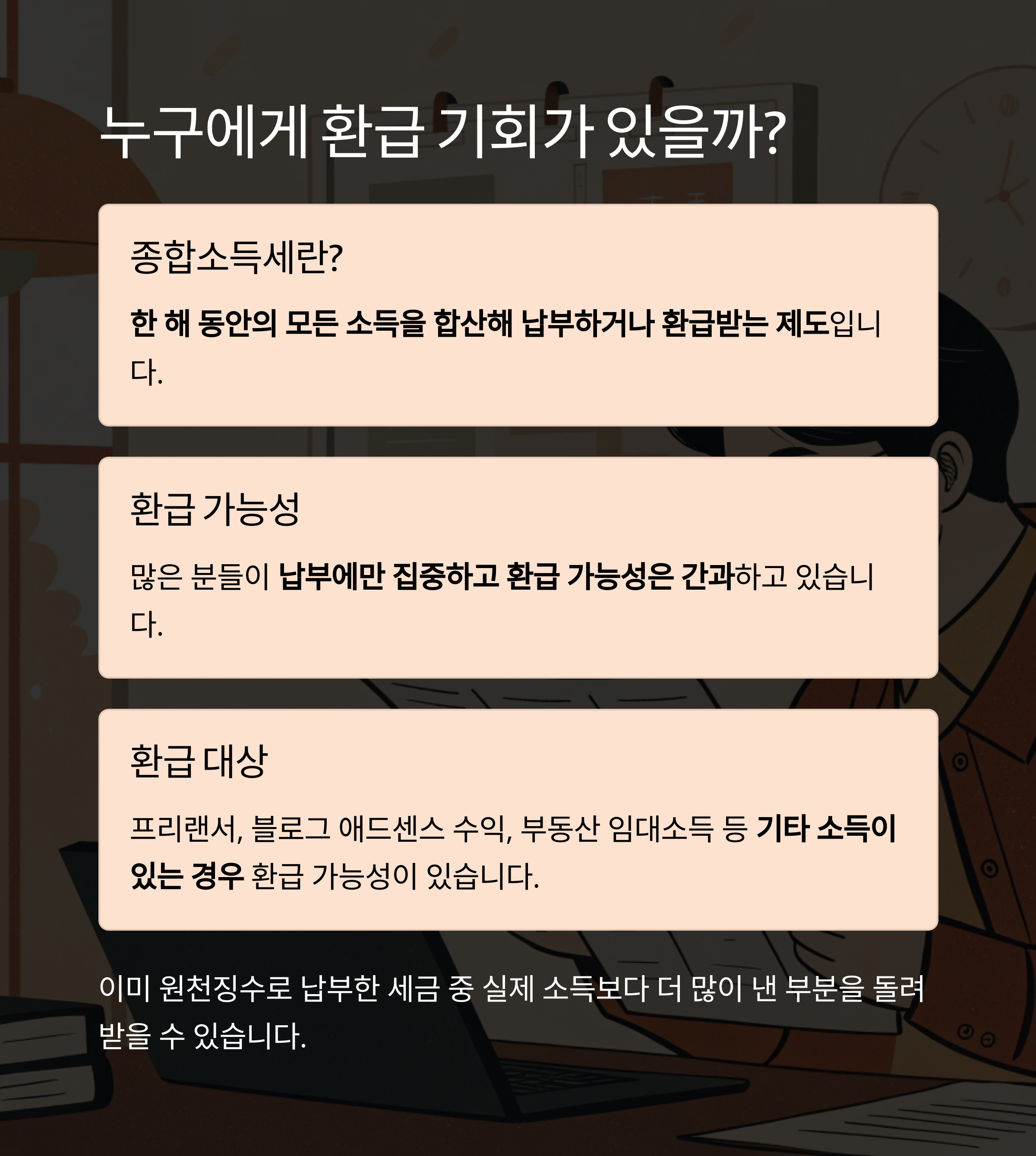 종합소득세는 한 해 동안의 모든 소득을 합산해 납부하거나 환급받는 제도입니다.