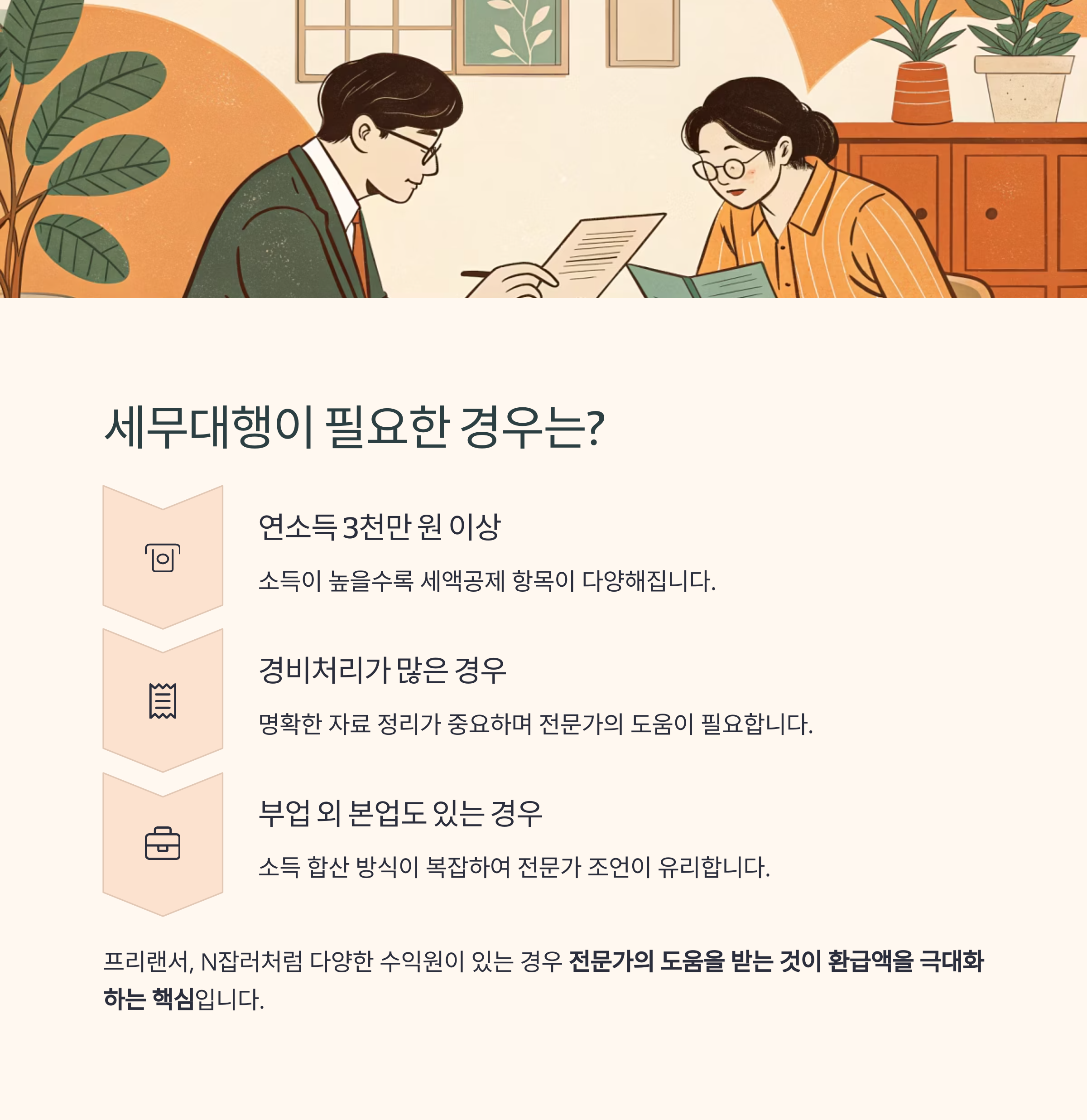 경비 처리를 꼼꼼히 해야 하므로 전문가의 도움을 받는 것이 환급액을 극대화하는 핵심입니다.