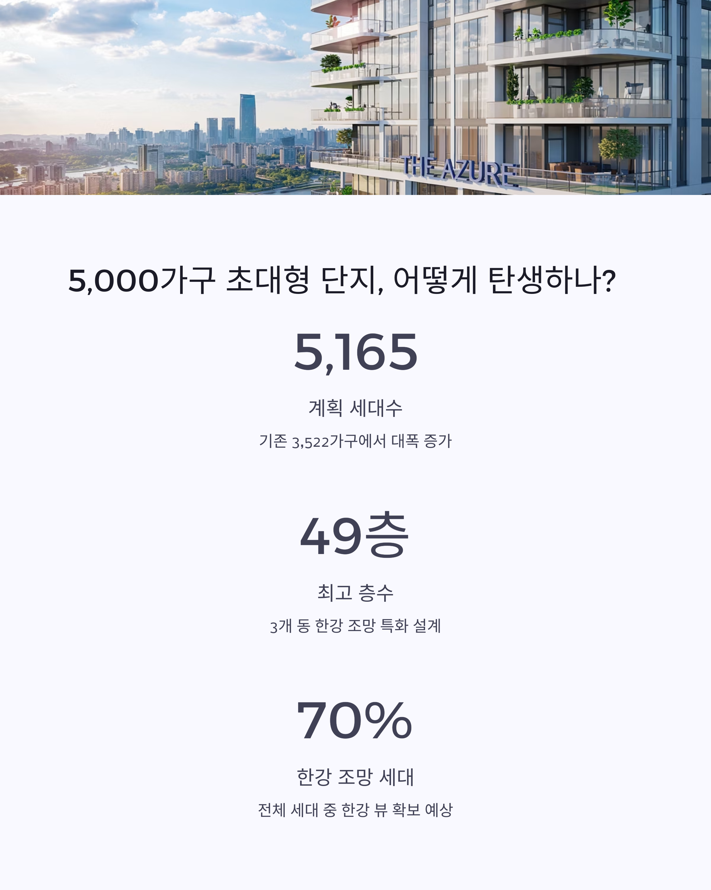 한강 조망권, 대규모 커뮤니티 시설, 브랜드 건설사 참여가 예고되어
