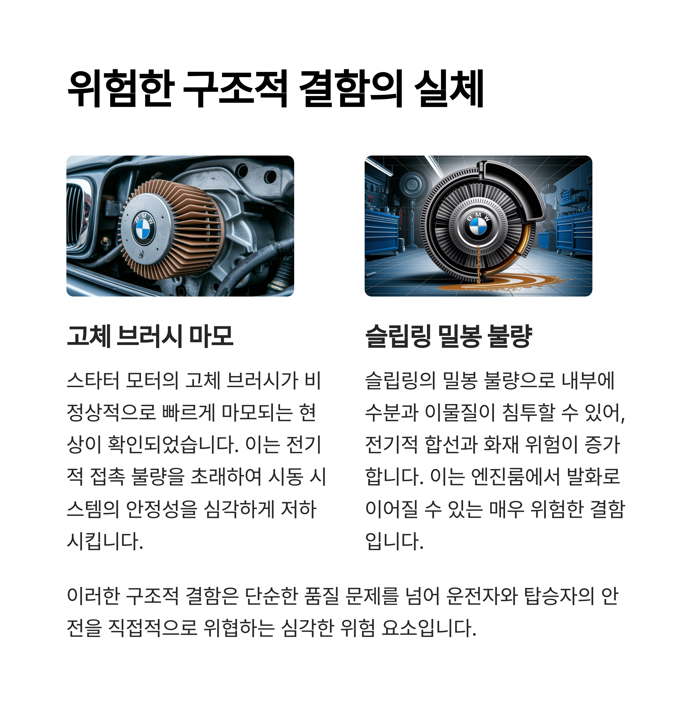 BMW의 발표에 따르면 이 중단은 소비자 안전 확보를 위한 사전 예방적 조치라고 했지만, 업계 전문가들은 스타터 모터와 관련된 구조적 결함이 핵심이라고 보고 있습니다. 특히 전기 과부하와 배터리 시스템 오류, 더 나아가 엔진룸 화재 가능성까지 제기되며 소비자들의 불안감은 더욱 커졌습니다.