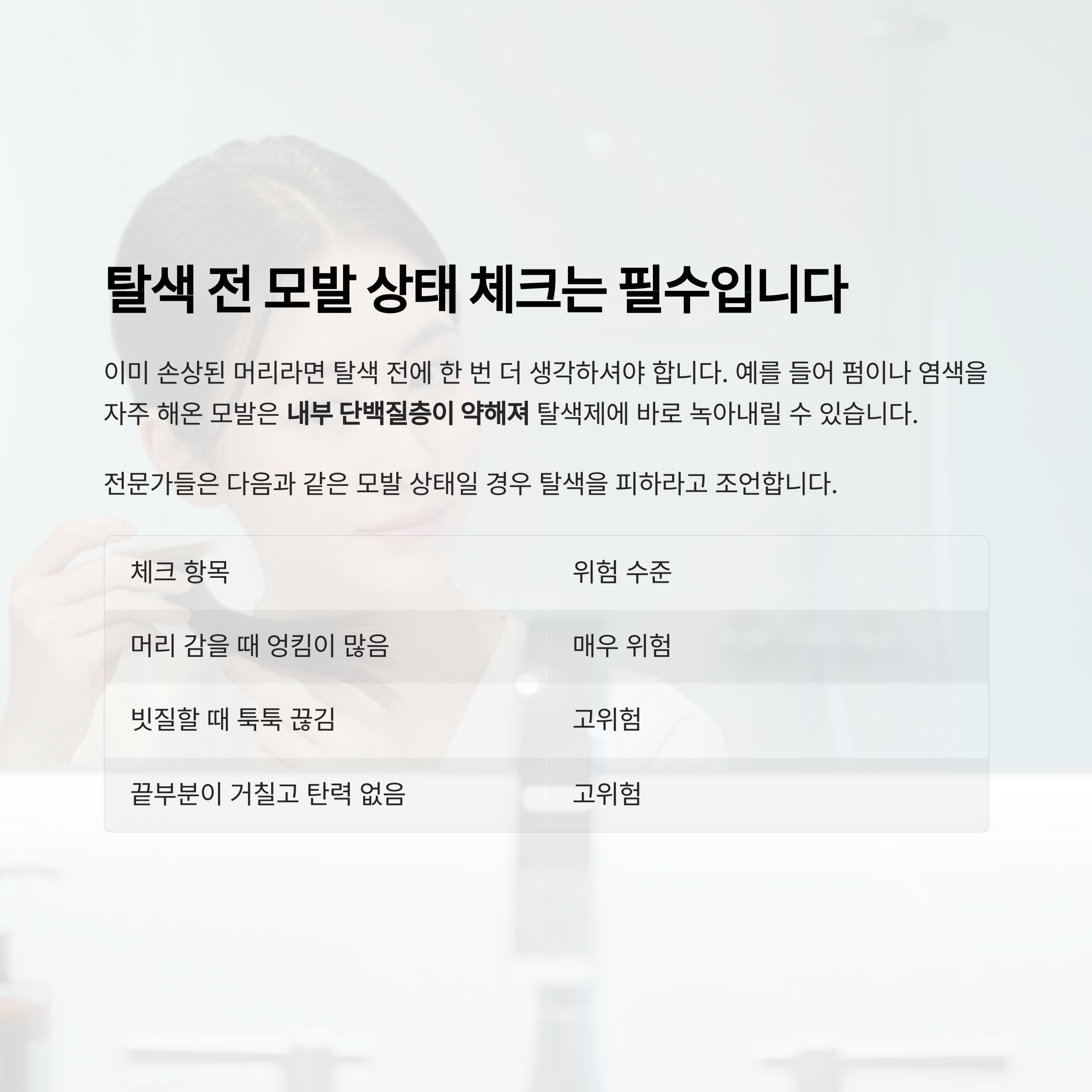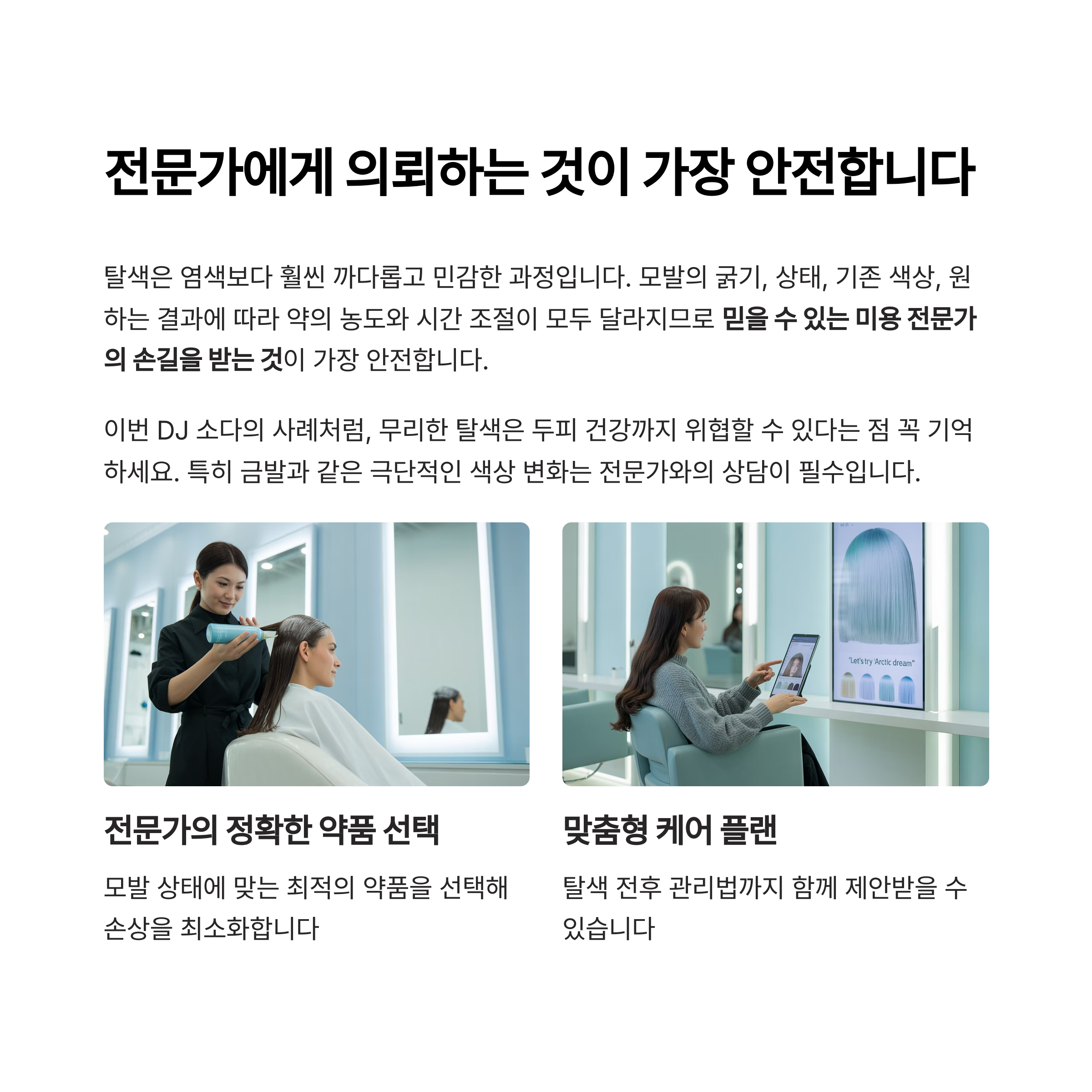 전문가의 상담 없이 무작정 집에서 탈색을 하는 건 큰 위험을 부를 수 있습니다.
