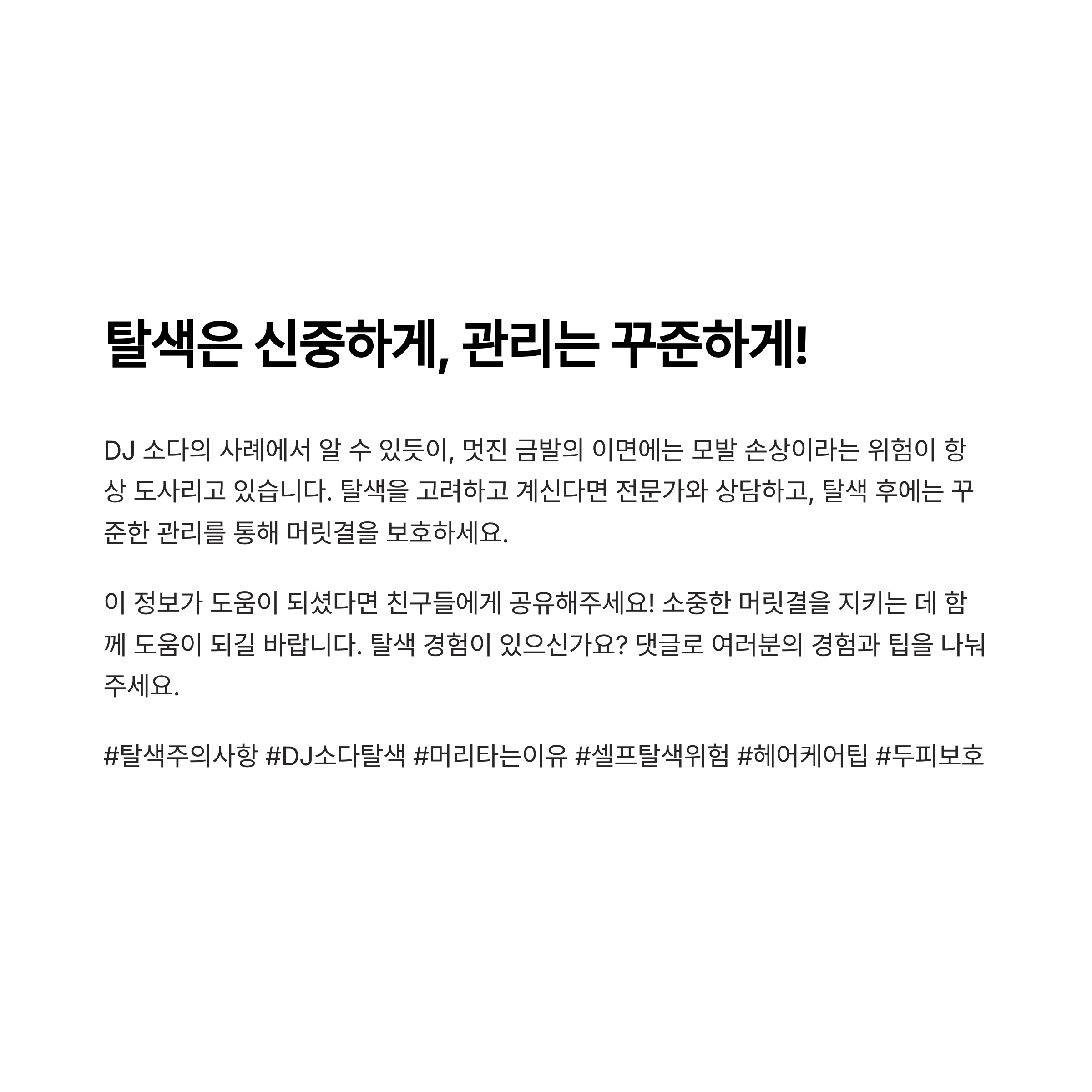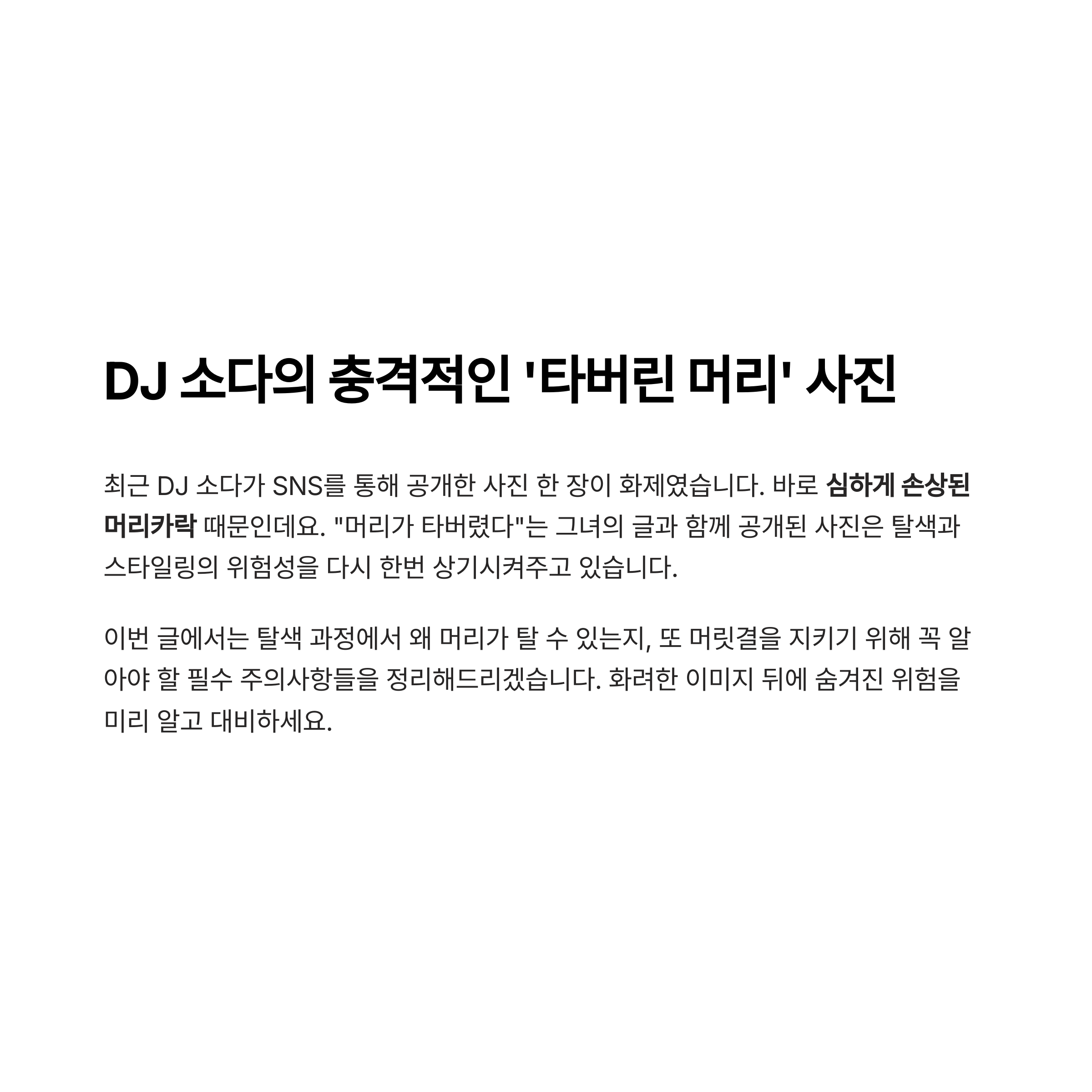 이번 DJ 소다의 사례처럼, 무리한 탈색은 두피 건강까지 위협할 수 있다는 점 꼭 기억하세요.