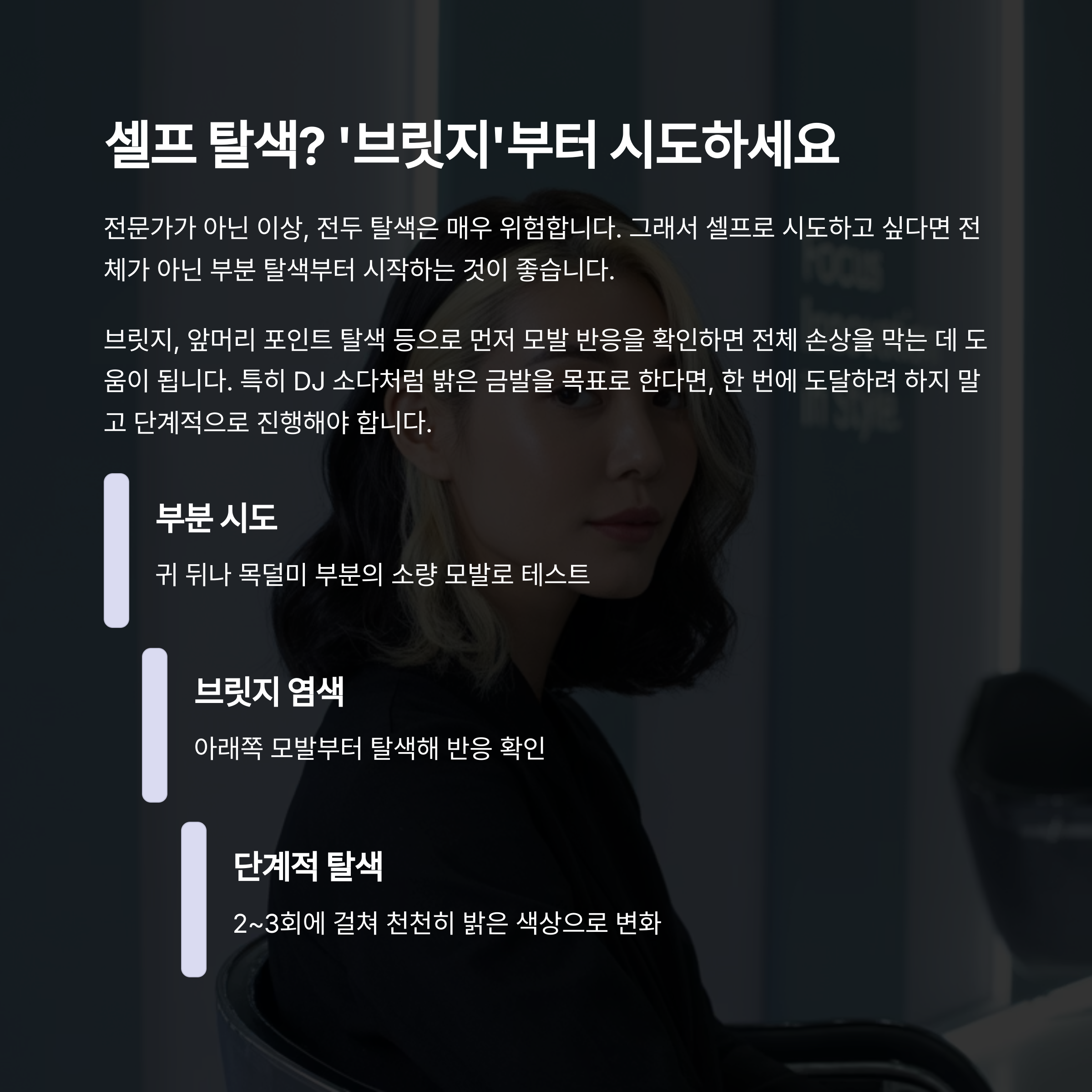 그래서 셀프로 시도하고 싶다면 전체가 아닌 부분 탈색부터 시작하는 것이 좋습니다.