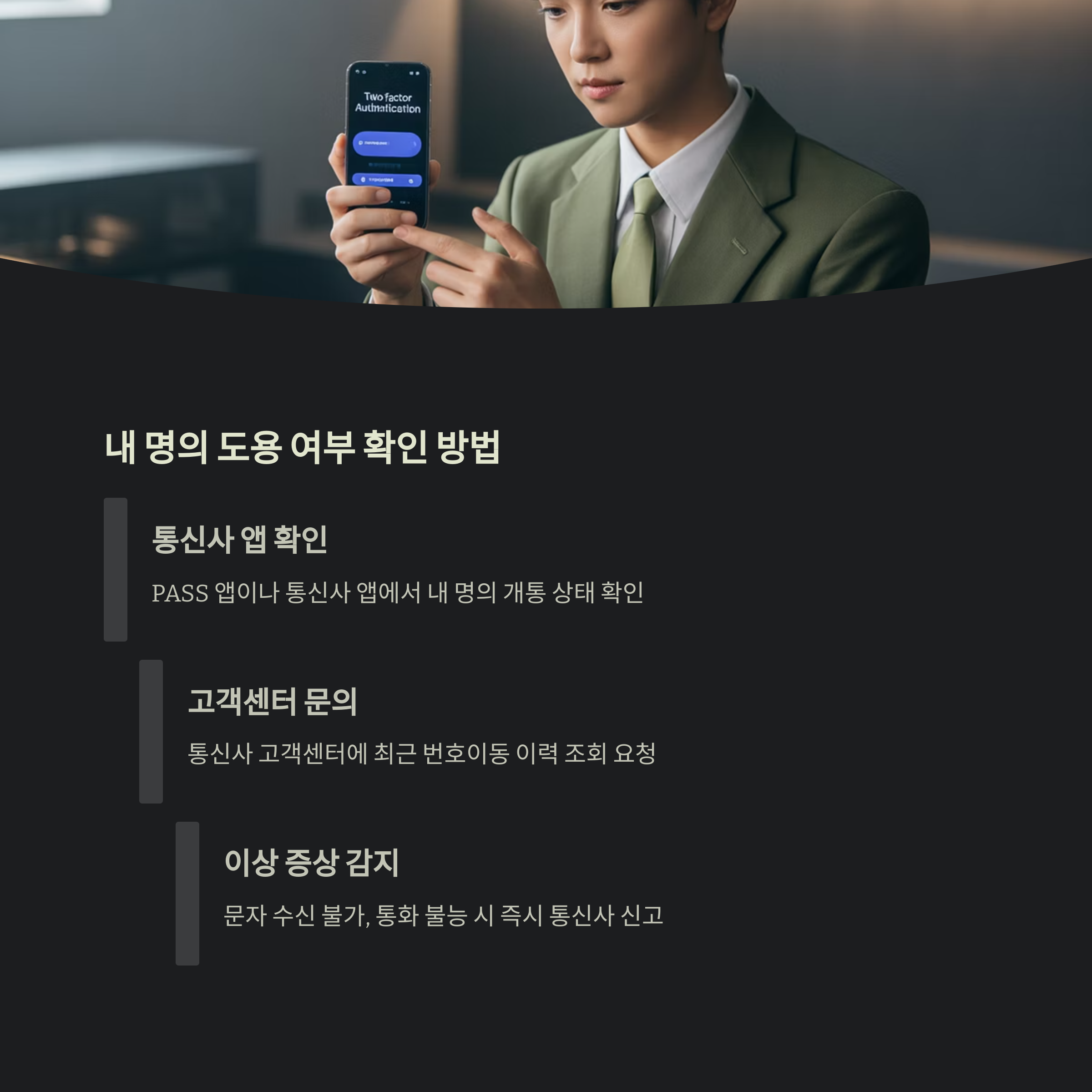 | 내 명의 개통 확인 | PASS 앱, 각 통신사 앱 사용 |